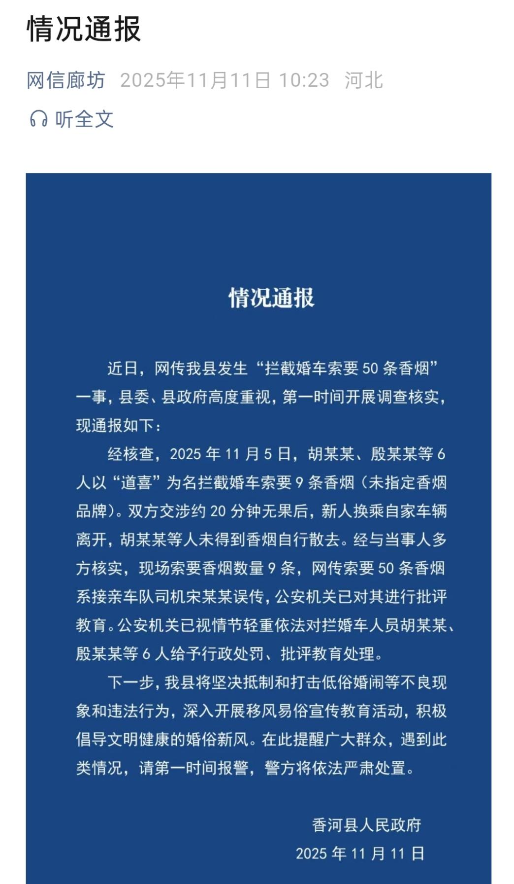 11月11日,“网信廊坊”微信公众号发布了香河县人民政府关于“拦截婚车索要50条香烟”事件的情况通报。