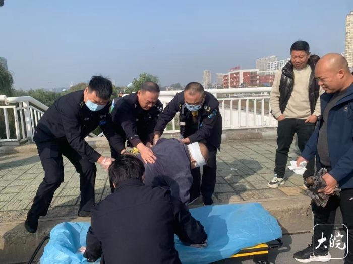 大皖新闻讯 11月10日10时许,在阜阳市泉河桥中段,一名老人行走时突然身体发软,不慎摔倒在地,头部磕在桥梁栏杆处受伤并伴随大量出血。这一幕被路过的阜阳市公安局交管支队颍泉大队民警发现,民警和路过市民立即上前救助。