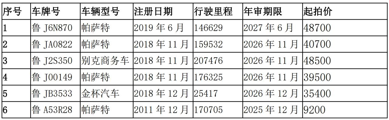 受委托,我单位定于2025年11月19日9:00通过中拍平台(https://paimai.caa123.org.cn/)以增价的方式现状公开拍卖:泰安地区帕萨特、别克、金杯等车辆,共6辆,单辆拍卖。车况以展示时为准,竞买保证金1万元/辆。
