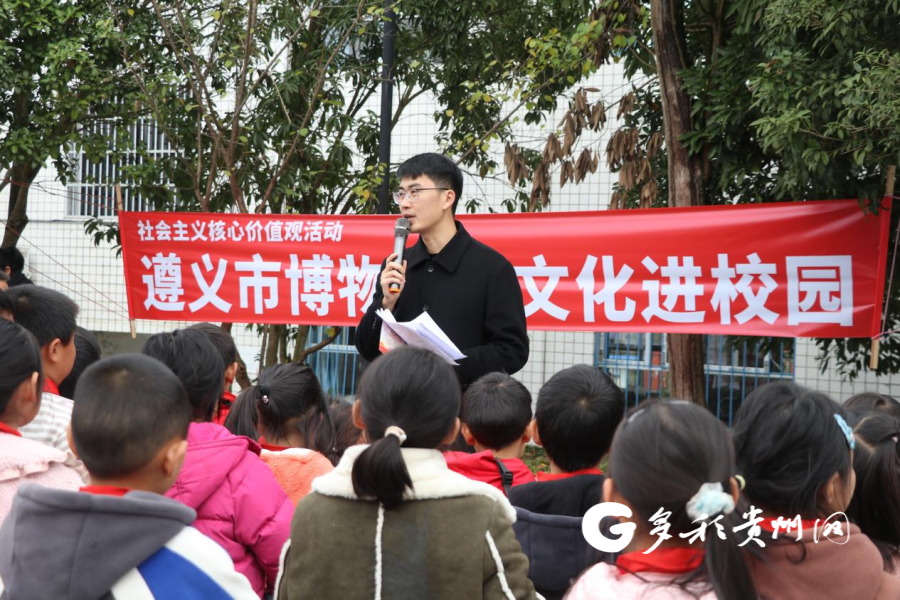 多彩贵州网讯 2025年11月19日,初冬暖阳洒满黔北山区,遵义市博物馆一行来到了位于山峦环抱之中的喇叭镇乐声小学,他们带着精心准备的展览、书籍和故事,将一堂生动而深刻的“文化课”送到了孩子们身边,让宁静的校园顿时化身为流动的文化课堂。
