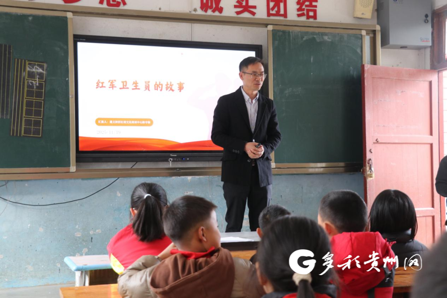 而在另外一边的教室里,温暖的气氛驱散了初冬的微寒,遵义市博物馆联合遵义市教育体育局、遵义开放大学邀请来自遵义转折红培文化培训中心的陈守驹老师,向同学们动情地讲述“红军卫生员的故事”,当听到红军卫生员在缺医少药的艰苦条件下,依然冒着枪林弹雨救治伤员,甚至不惜牺牲自己时,孩子们屏息静气,眼神专注,故事中那份跨越时代的坚守与奉献,如暖流般淌过现场每个人的心田。