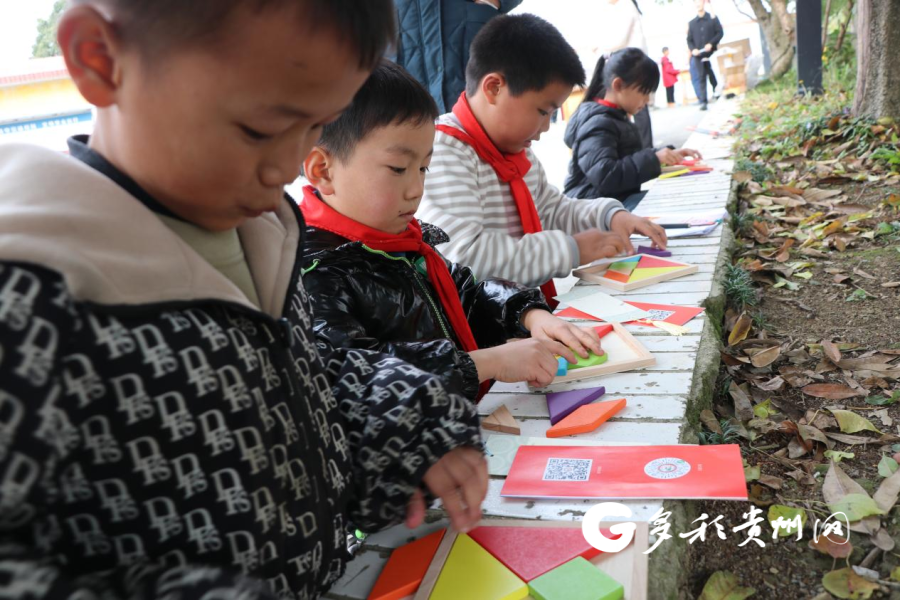 “我国有多少个民族?”——“56个!”在有奖问答环节,孩子们手持《铸牢中华民族共同体意识应知应会手册》争先恐后回答,让“中华民族一家亲”的理念更加可感可知。一旁的七巧板互动区引起了孩子们极大的兴趣,七巧板在孩子们手中不停变换,拼出多种图形,开开心心感受传统文化智慧与乐趣。