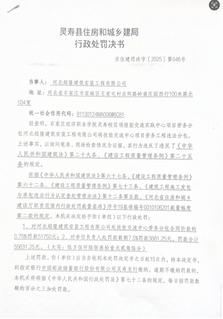 文号“灵住建罚决字﹝2025﹞第046号”行政处罚决定书显示,石家庄经济职业学院灵寿校区技能交流实践中心项目劳务分包河北超隆建筑安装工程有限公司将技能交流中心项目劳务工程违法分包。其行为违反了《中华人民共和国建筑法》第二十九条、《建设工程质量管理条例》第二十五条的规定。