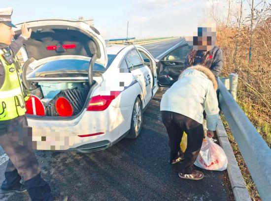 正在该路段巡逻的朱警官发现险情后,立即启动应急处置流程:两名民警分工协作,一人第一时间在来车方向150米外规范布设锥桶警示区,开启警车警灯及警报器,指挥疏导后方车辆减速变道。一人将乘客全部引导到护栏外安全区域,将这3名衣衫单薄群众引导至警示安全区内警车取暖,同步联系路政部门,协调转运车辆支援。