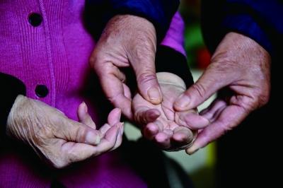 日复一日,李晓金给妻子按摩变形的双手。