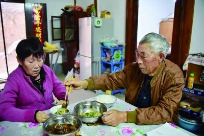 在家里堂屋方桌上,李晓金陪伴瘫痪的妻子一日三餐35年了。