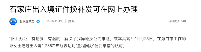石家庄市公安局出入境管理支队相关负责人介绍称,自今年11月20日起,出入境证件换补发可以“全程网办”。石家庄市作为河北省首个试点城市,办证再提速,市民办理普通护照、往来港澳通行证、往来台湾通行证换补发业务,不用再去线下的业务大厅,只需要在网上操作即可。