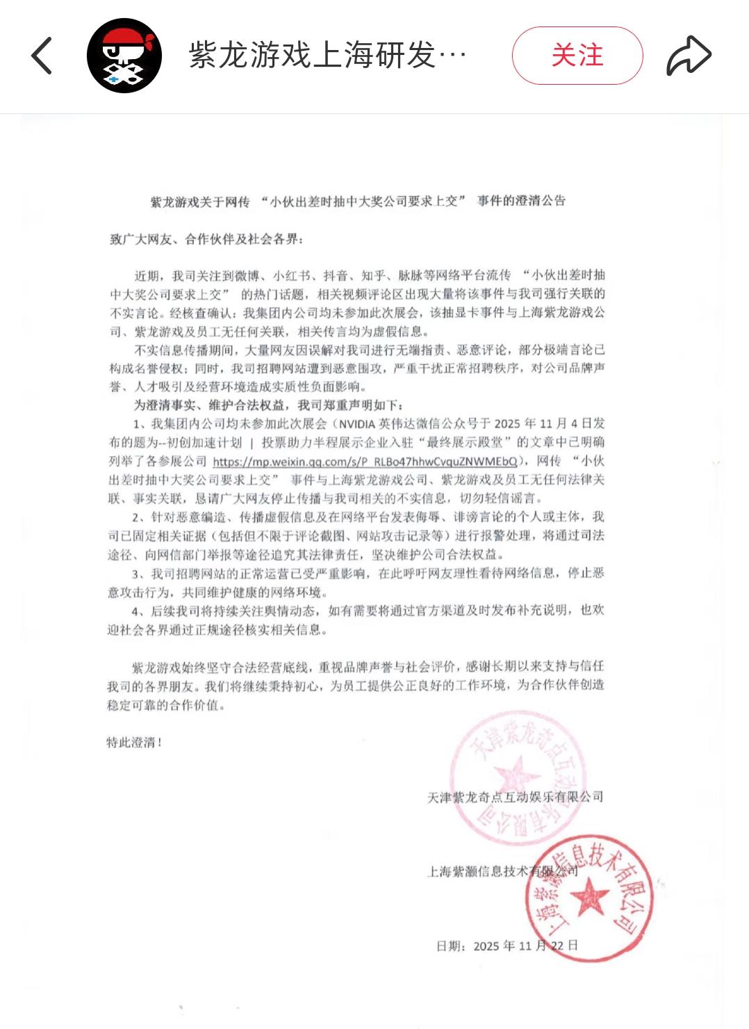 11月22日,紫龙游戏上海研发中心发布澄清公告称,经核查确认:该集团内公司均未参加此次展会,该抽显卡事件与上海紫龙游戏公司、紫龙游戏及员工无任何关联,相关传言均为虚假信息。并提到,公司为此受到负面影响,已固定相关证据(包括但不限于评论截图、网站攻击记录等)进行报警处理,将通过司法途径、向网信部门举报等途径追究其法律责任,坚决维护公司合法权益。
