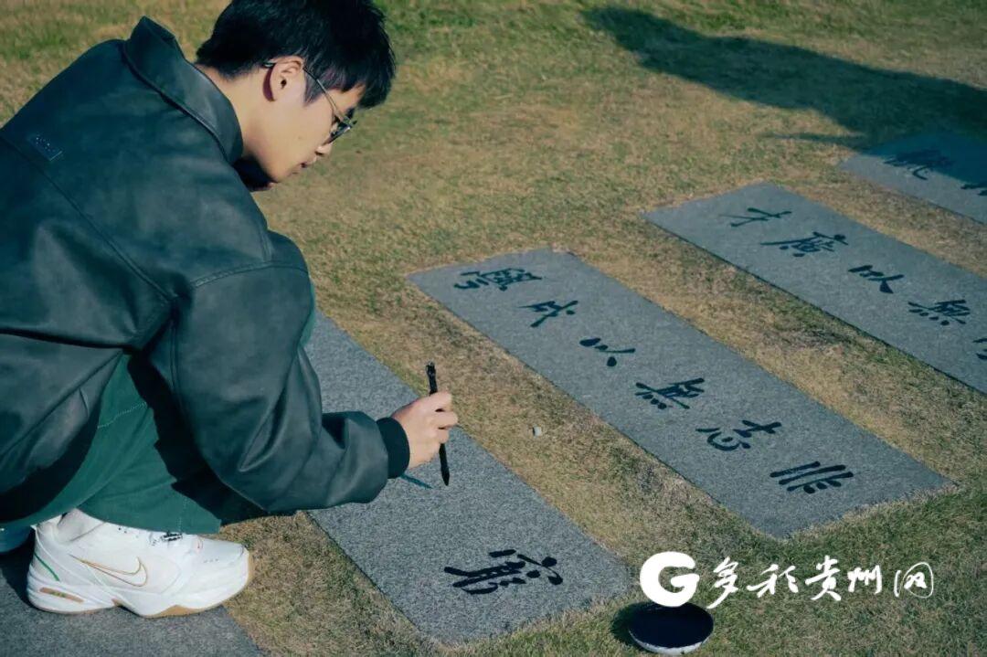 ▲遵义医科大学墨缘书画协会成员、21级管理学院学生陈峻熙为校园石阶“化妆”