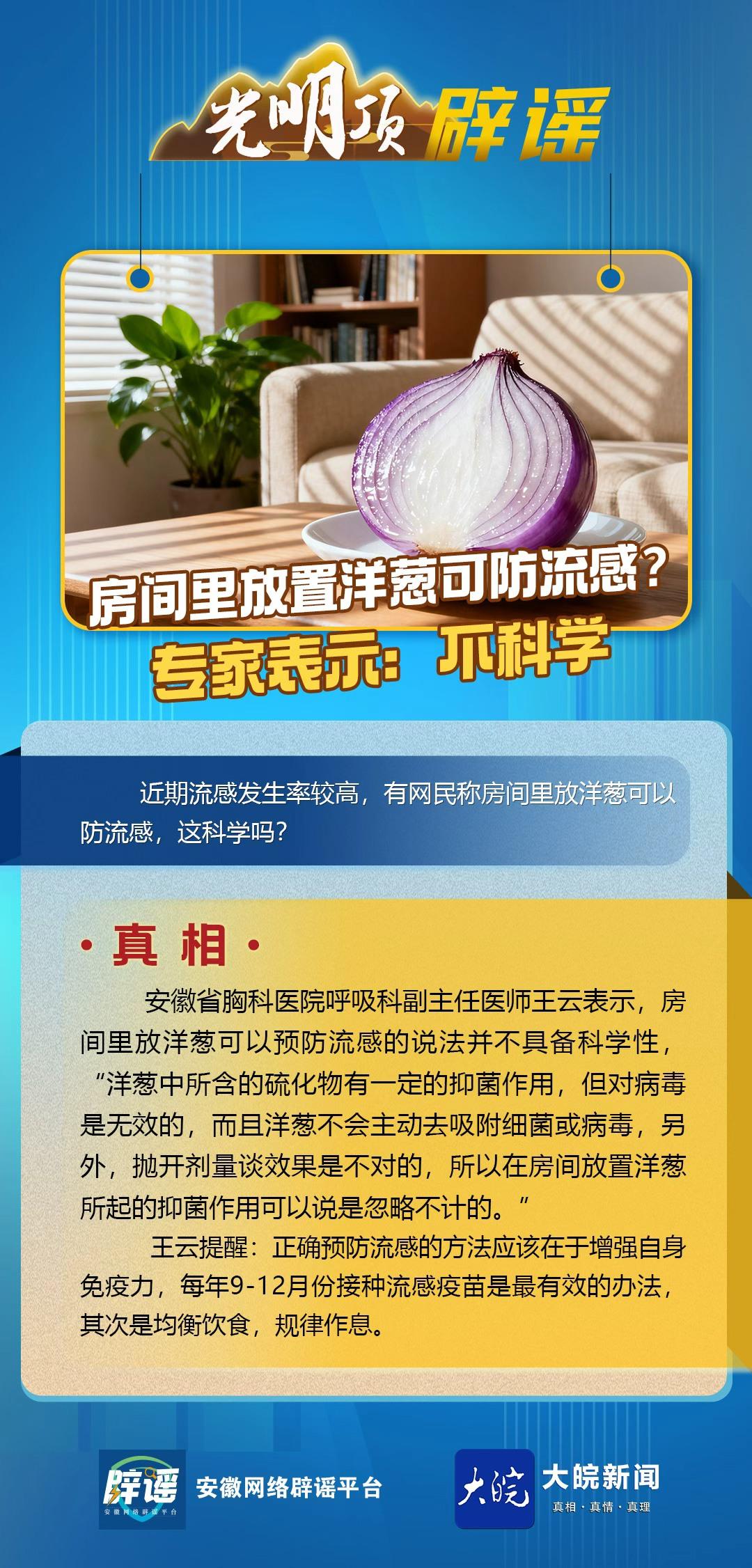 大皖新闻讯 近期流感发生率较高,有流言称房间里放洋葱可以防流感,这些言论是否具有科学性?11月26日晚,大皖新闻记者就此事咨询了安徽省胸科医院呼吸科副主任医师王云。