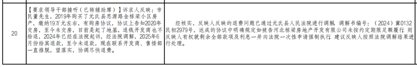 6、诉求人反映:市民董先生,2019年购买了元氏县思源路金栋梁小区房产,缴纳19万元左右,有购房协议,协议上告知2020年交房,至今未交房,目前是起了地基,退钱开发商也不给退,2024年已经在法院起诉,经法院调解,2025年6月份给其退款,至今未退款,现在联系开发商、售楼部一直推脱,望落实,协调尽快退费。