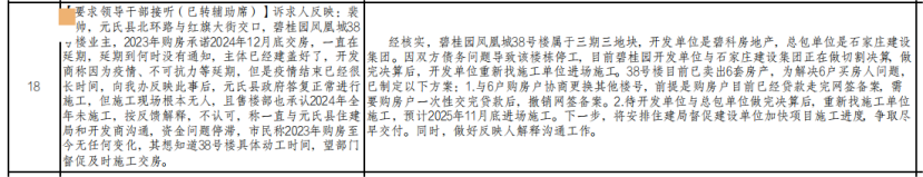 对此元氏县住建局回复:经核实,碧桂园凤凰城38号楼属于三期三地块,开发单位是碧科房地产,总包单位是石家庄建设集团。因双方债务问题导致该楼栋停工,目前碧桂园开发单位与石家庄建设集团正在做切割决算,做完决算后,开发单位重新找施工单位进场施工。38号楼目前已卖出6套房产,为解决6户买房人问题,已制定以下方案:1.与6户购房户协商更换其他楼号,前提是购房户目前已经贷款走完网签备案,需要购房户一次性交完贷款后,撤销网签备案。2.待开发单位与总包单位做完决算后,重新找施工单位施工,预计2025年11月底进场施工。下一步,将安排住建局督促建设单位加快项目施工进度,争取尽早交付。同时,做好反映人解释沟通工作。