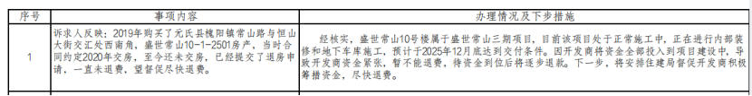 对此,元氏县住建局表示:经核实,盛世常山10号楼属于盛世常山三期项目,目前该项目处于正常施工中,正在进行内部装修和地下车库施工,预计于2025年12月底达到交付条件。因开发商将资金全部投入到项目建设中,导致开发商资金紧张,暂不能退费,待资金到位后将逐步退款。下一步,将安排住建局督促开发商积极筹措资金,尽快退费。