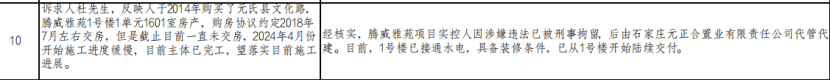对此元氏县住建局回复:经核实,腾威雅苑项目实控人因涉嫌违法已被刑事拘留,后由石家庄元正合置业有限责任公司代管代建。目前,1号楼已接通水电,具备装修条件,已从1号楼开始陆续交付。