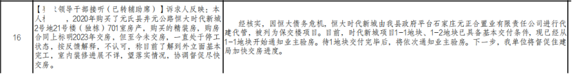 对此元氏县住建局回复:经核实,因HD债务危机,HD时代新城由我县政府平台石家庄元正合置业有限责任公司进行代建代管,被列为保交楼项目。目前,时代新城项目1-1地块、1-2地块已具备基本交付条件,现已经从1-1地块开始通知业主验房。待1地块交付完毕后,将依次通知业主验房。下一步,我单位将督促住建局加快交房进度。