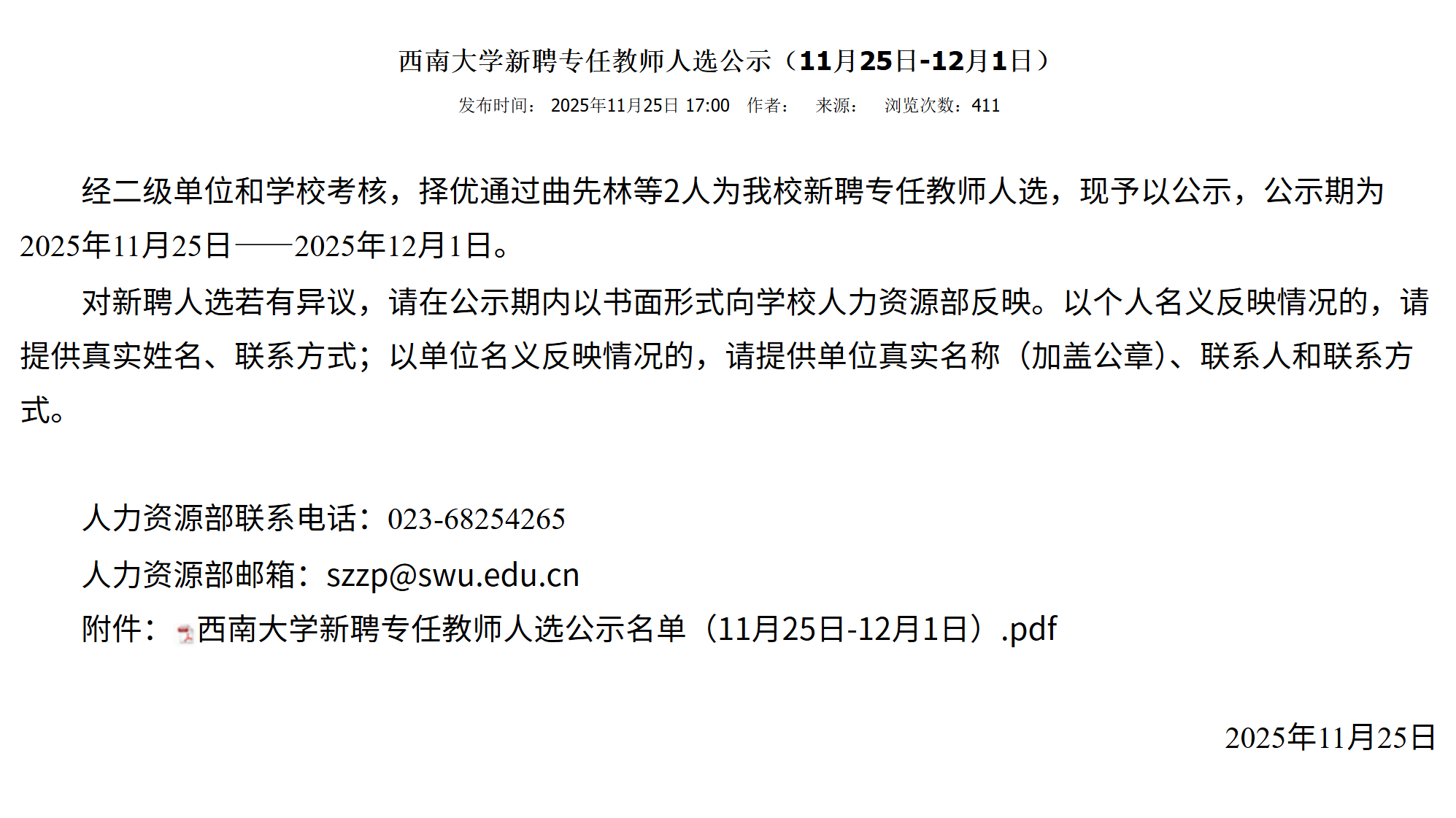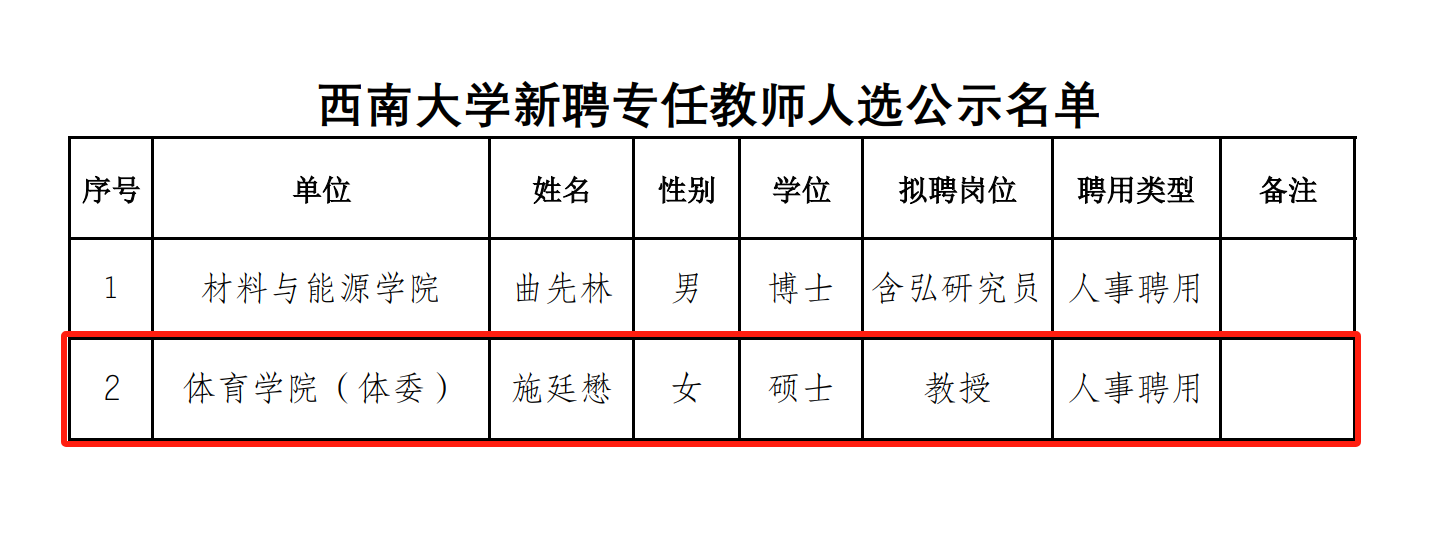 西南大学公示新聘专任教师人选。
