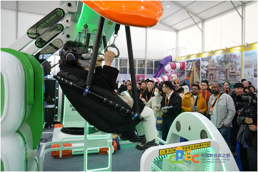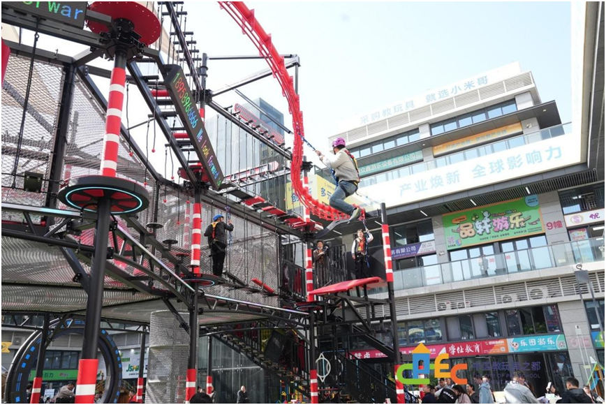 华夏游乐有限公司带来的第三代空中拓展产品也同样吸引众多客商排队体验。该产品在滑索、攀爬架、组合滑梯等传统拓展设备基础上,还融合增加了空中足球等互动运动游玩项目,寓教于乐,兼顾体能训练和趣味性。温州教玩具协会常务副会长金利群认为,无动力、动力教玩具的同台展示,有效补充并丰富了展品矩阵,促进了跨区域产业资源的深度融合与协同升级。