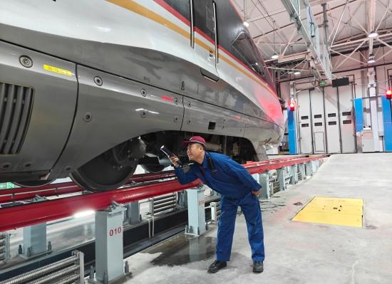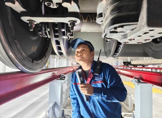 在存车场的另一侧,另一位“守夜人”正在对动车组底部进行检查。他们使用手电筒仔细照看每一个部件,检查是否有结冰、漏水等情况。在寒风中,他们的动作迅速而精准,每一个动作都透露出专业与熟练。这些看似平凡的工作,却是保障动车组安全运行不可或缺的一环。