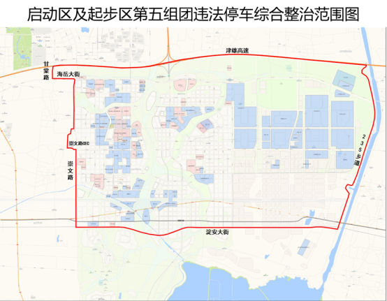 启动区及起步区第五组团违法停车综合整治范围图中主要道路两侧便道、市政公共区域违反规定停放的机动车、非机动车,其他影响道路通行、占压盲道和存在安全隐患的违法行为。