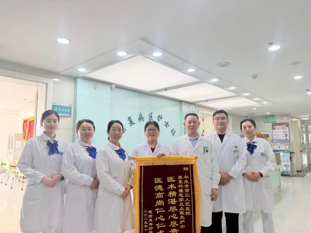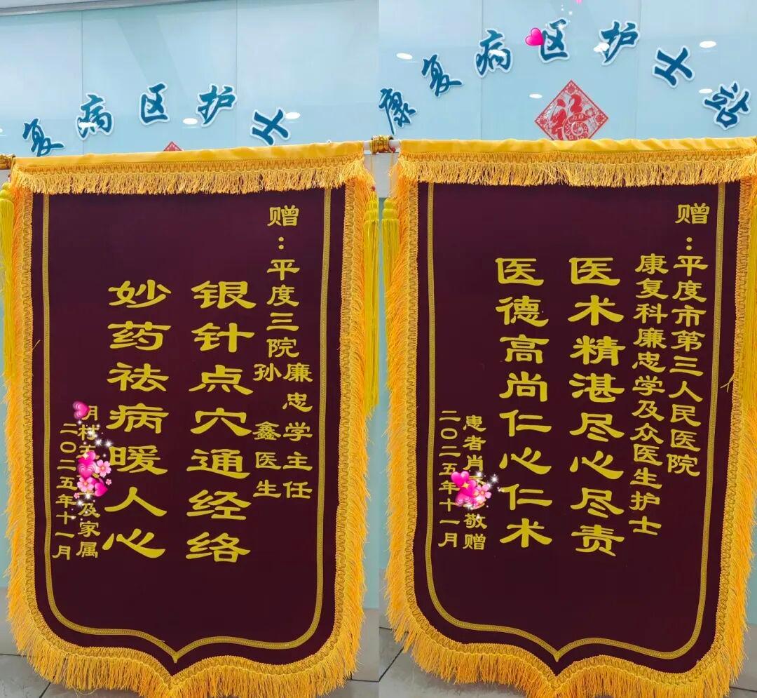 鲁网12月1日讯近日,平度市第三人民医院康复科接连收获两份沉甸甸的“礼物”。两位康复出院的患者及家属不约而同地选择用锦旗这种最传统也最真挚的方式,表达对康复科全体医护人员的感激。一时间,科室里锦旗红火,情意暖融,成为一道动人的风景。