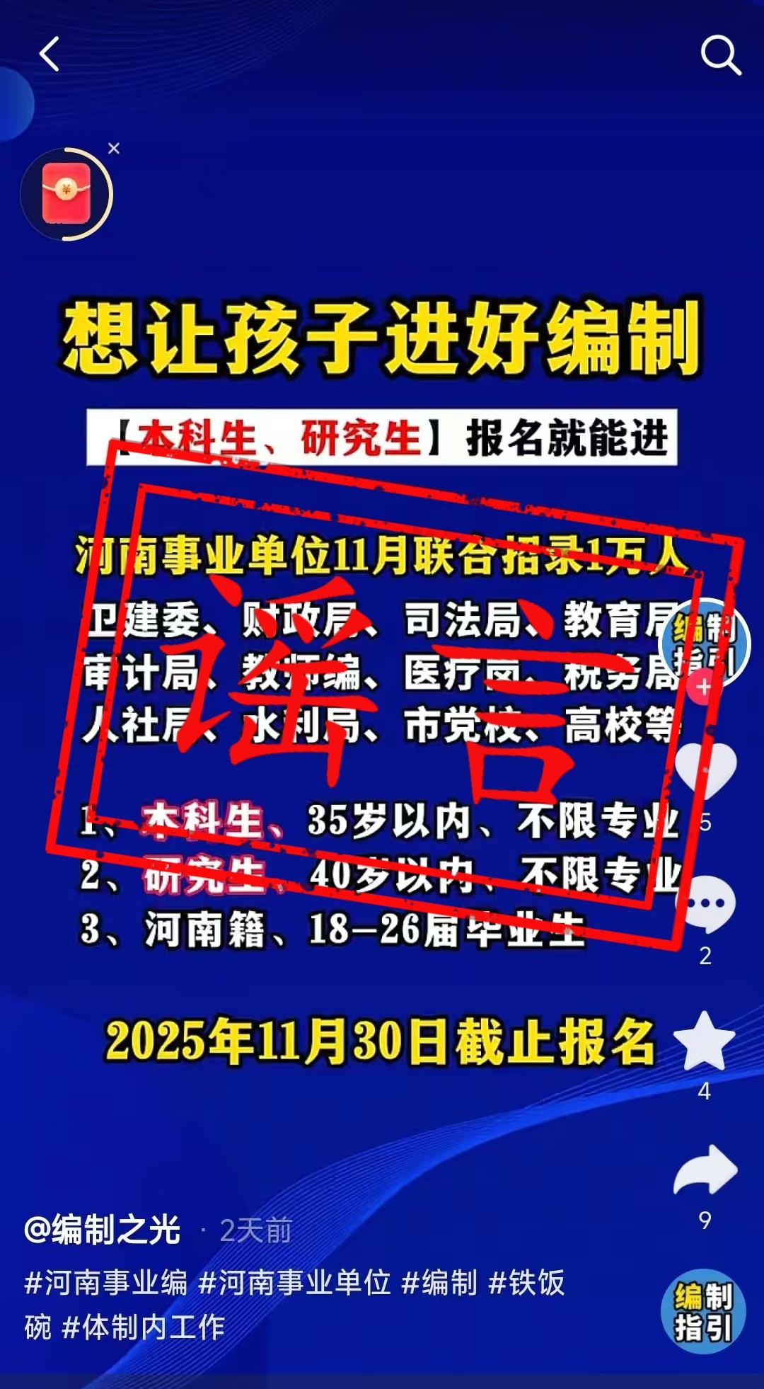 郑州某教育公司员工鞠某叶为吸引流量、获取业绩,使用剪辑软件拼接网络素材,编造发布“河南事业编招聘万人,本科起报”等各类虚假招聘信息累计300余条,造成不良影响。经公安机关调查,鞠某叶对违法行为供认不讳,公安机关已依法对其处以行政处罚。