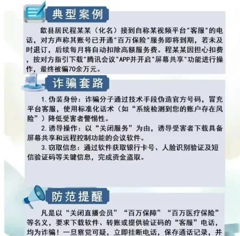 歙县居民程某某(化名)接到自称某视频平台“客服”的电话,对方声称其账号已开通“百万保险”服务且即将到期,若未及时退订,后续每月将自动扣除高额服务费。程某某因担心扣费,按对方指引下载了一款APP并开启“屏幕共享”功能进行操作,最终被骗70余万元。