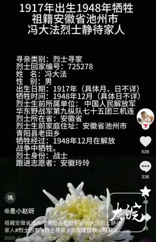 11月20日,“安徽玲玲”在网络平台发布的烈士寻亲信息显示,冯大法烈士生于1917年(具体月日不详),1948年12月在解放战争中英勇牺牲,生前隶属于中国人民解放军华东野战军第九纵队七十五团三机连,其籍贯标注为安徽省池州市青阳县老田乡,寻亲编号为725278,目前由安徽宿州志愿者“安徽玲玲”(真名:赵玲)跟进寻亲事宜。