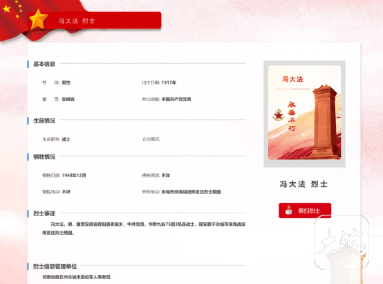 记者查询中华英烈网发现,冯大法在该网站明确为烈士,籍贯安徽省青阳县老田乡,1917年出生,中共党员,华野九纵75团3机连战士,牺牲于1948年12月,牺牲原因与牺牲地点均不详,现安葬于河南省永城市淮海战役陈官庄烈士陵园。烈士信息管理单位为河南省商丘市永城市退役军人事务局。