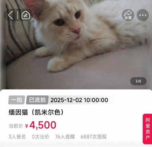 大皖新闻讯 12月2日,大皖新闻记者从阿里资产平台看到,一只凯米尔色缅因猫因为无人出价,一拍流拍。起拍价4500元,吸引了6000多人次围观,三人报名竞拍,但均未出价。