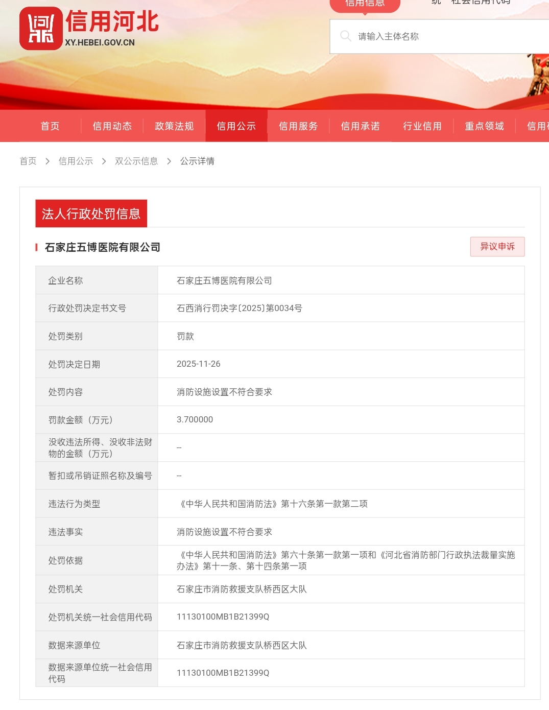 据信用河北官网公开信息,近日,因消防设施设置不符合要求,石家庄五博医院有限公司被石家庄市消防救援支队桥西区大队罚款3.7万元。