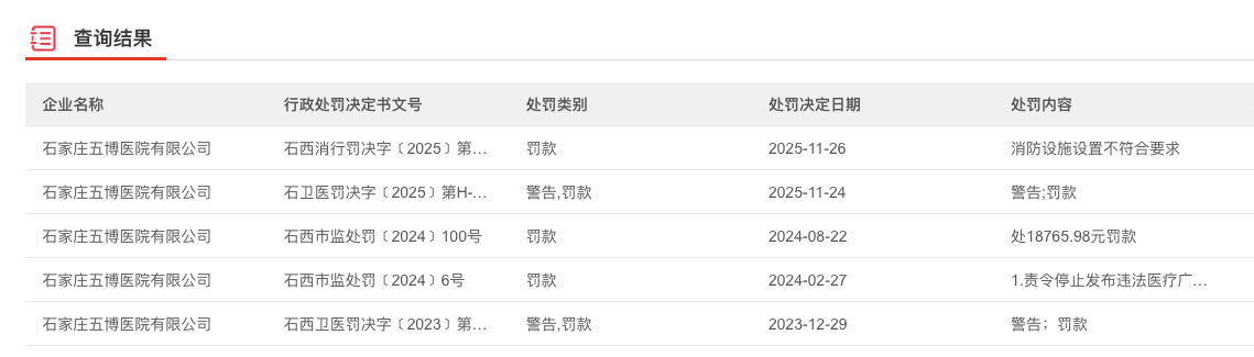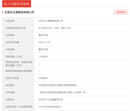 值得关注的是,2025年11月24日,石家庄五博医院未按规定实施医疗质量安全管理制度,被石家庄市卫生健康委员会警告并处罚款1.5万元。