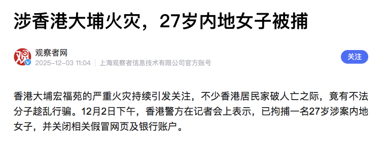 香港大埔宏福苑的严重火灾持续引发关注,不少香港居民家破人亡之际,竟有不法分子趁乱行骗。12月2日下午,香港警方在记者会上表示,已拘捕一名27岁涉案内地女子,并关闭相关假冒网页及银行账户。
