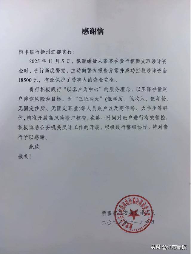 近日,恒丰银行扬州江都支行凭借高度的职业敏感与扎实的风险防控机制,成功堵截一起涉诈账户的取现申请,避免了1.85万元涉案资金的非法支取,以专业担当和务实行动守护人民群众的“钱袋子”。