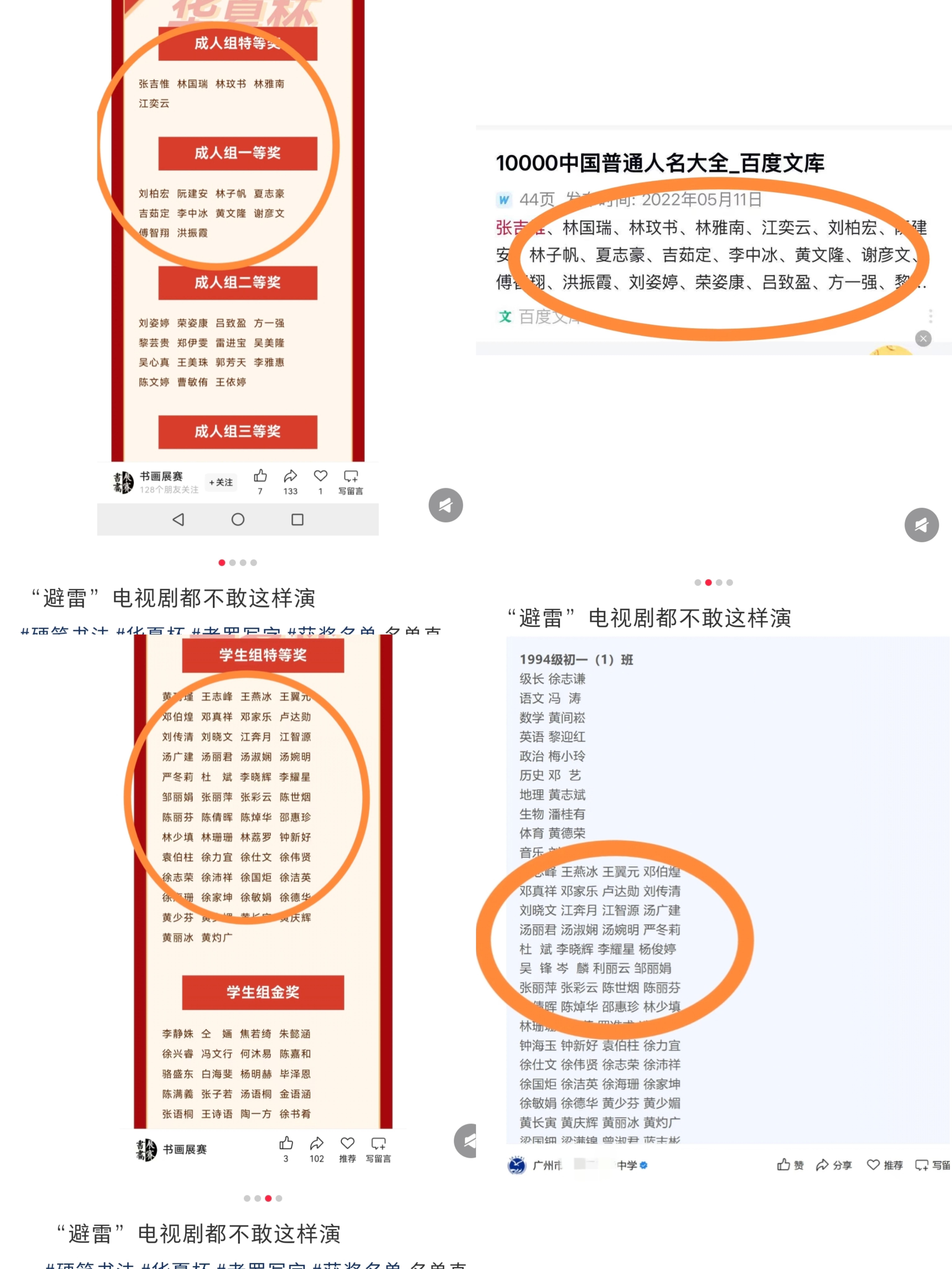 网民发布的帖子内容显示,该比赛设置了成人组特、一、二、三等奖以及学生组特等奖、金奖等奖项,并公布了获奖名单。但是这些获奖者姓名却与某文库2022年发布的《10000中国普通人名大全》和某中学公布的上世纪90年代学生花名册重合,引发热议。在评论区,网民纷纷留言,认为此举有造假、骗钱之嫌。