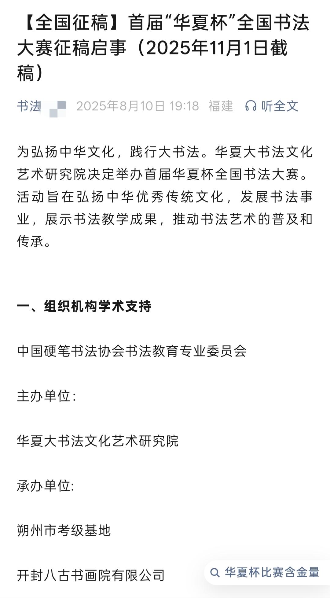 大皖新闻记者注意到,今年8月,有多个书法相关的账号发布了首届“华夏杯”全国书法大赛征稿启事,提到该赛事主办单位为华夏大书法文化艺术研究院,承办单位为朔州市考级基地和开封八古书画院有限公司,组织机构学术支持为中国硬笔书法协会书法教育专业委员会。征稿对象为全国各界成人、学生、广大书法爱好者等,征稿日期为2025年8月1日至11月1日。