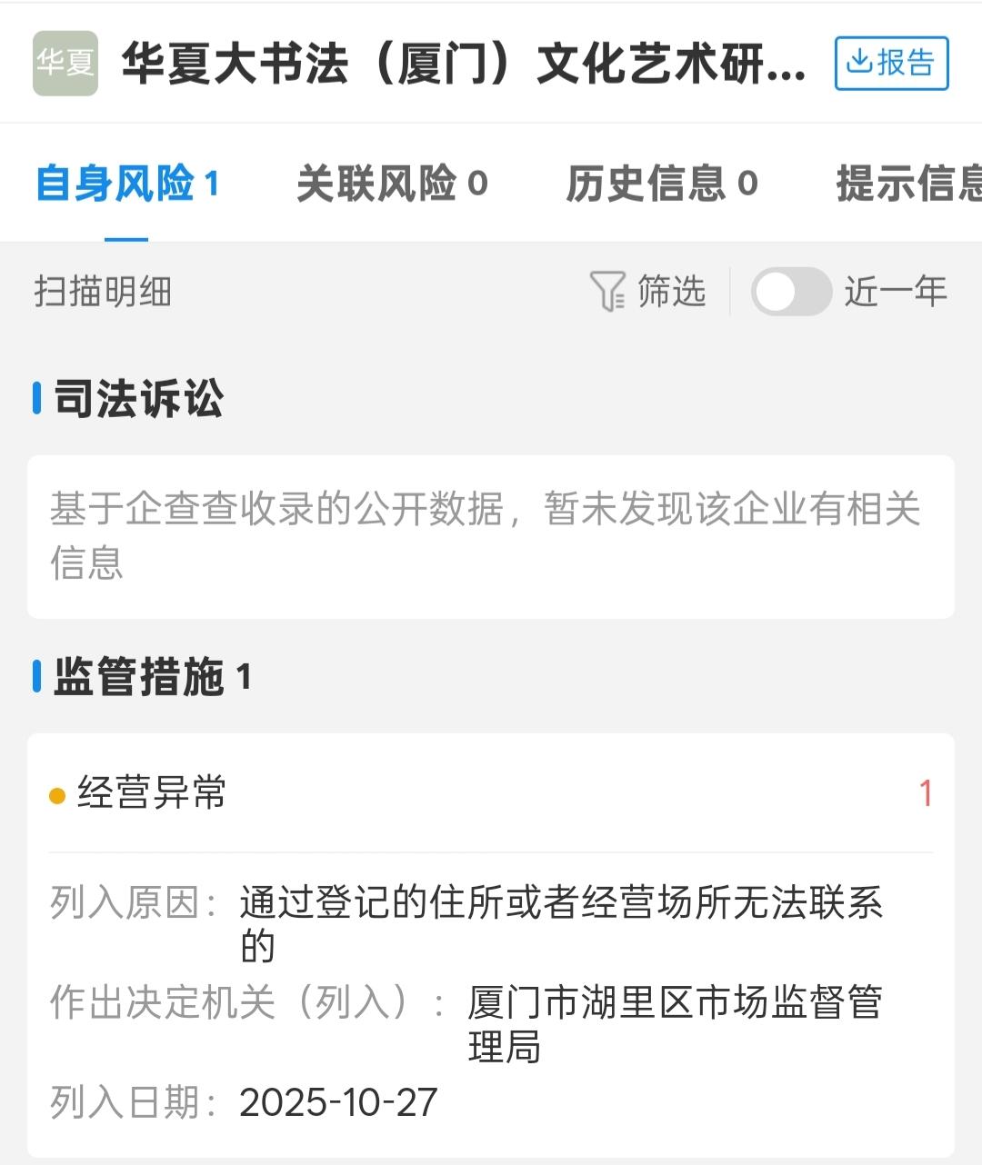 记者查询发现,与“华夏大书法文化艺术研究院”相关的公开信息较少,企查查平台信息同样显示,无直接用此名的机构,只有华夏大书法(厦门)文化艺术研究院(有限合伙),成立于2025年7月,执行事务合伙人正是征稿启事中的联系人袁某。已于10月27日被厦门市湖里区市场监管局列入经营异常,原因是“通过登记的住所或者经营场所无法联系的”。