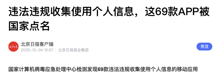 依据《网络安全法》《个人信息保护法》等法律法规,按照《中央网信办、工业和信息化部、公安部、市场监管总局关于开展2025年个人信息保护系列专项行动的公告》要求,经国家计算机病毒应急处理中心检测,69款移动应用存在违法违规收集使用个人信息情况,现通报如下。