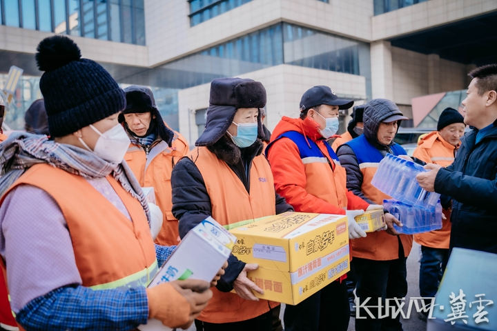 又一个清晨,另一批志愿者也将温暖送到了环卫工人身边。在丰南区一处环卫站,志愿者们带着牛奶、火腿肠、方便面、矿泉水等物资,逐一递到环卫工人手中,还不忘送上一份问候,向这些“城市美容师”道一声辛苦。