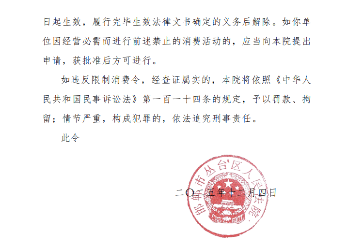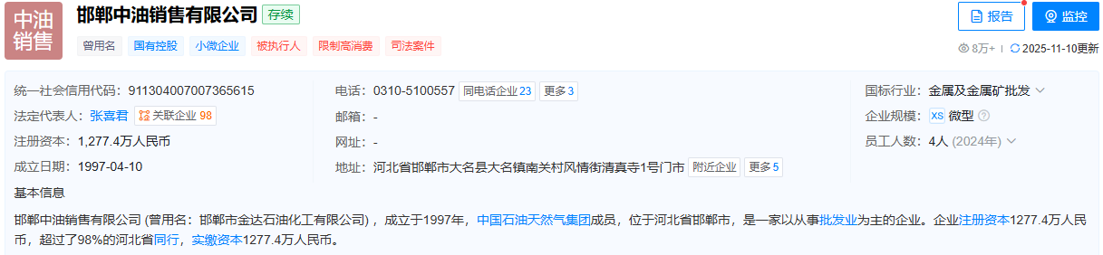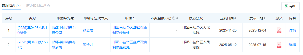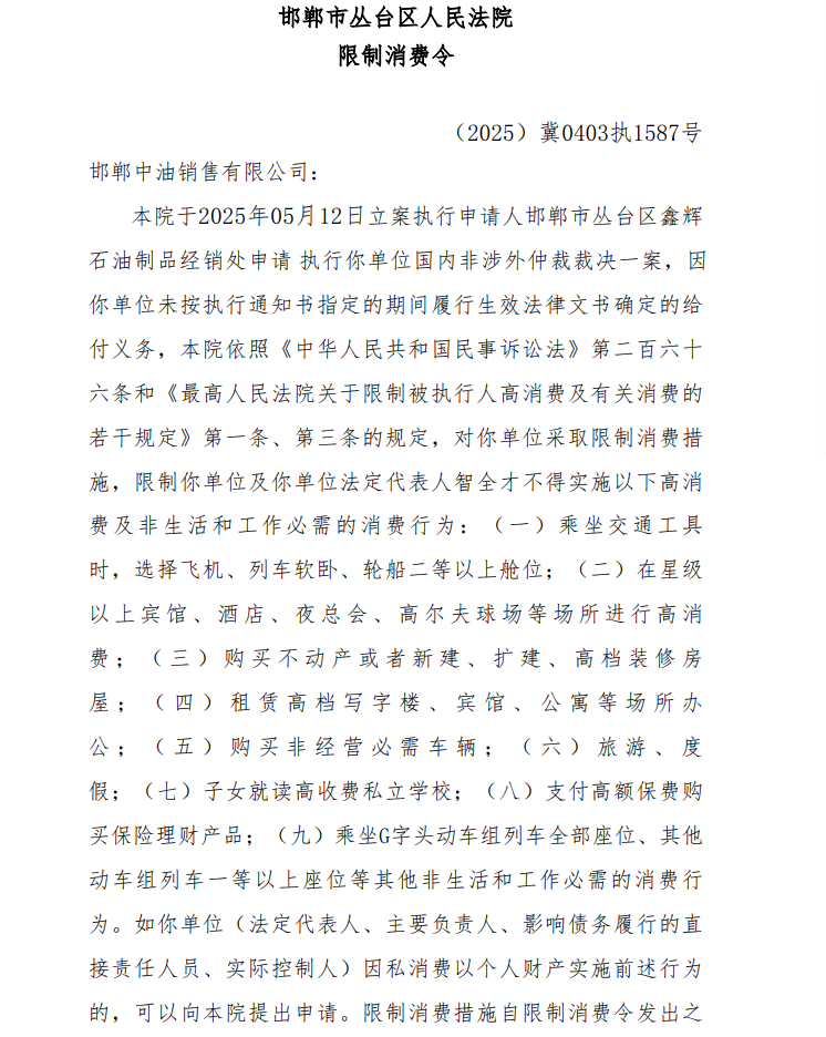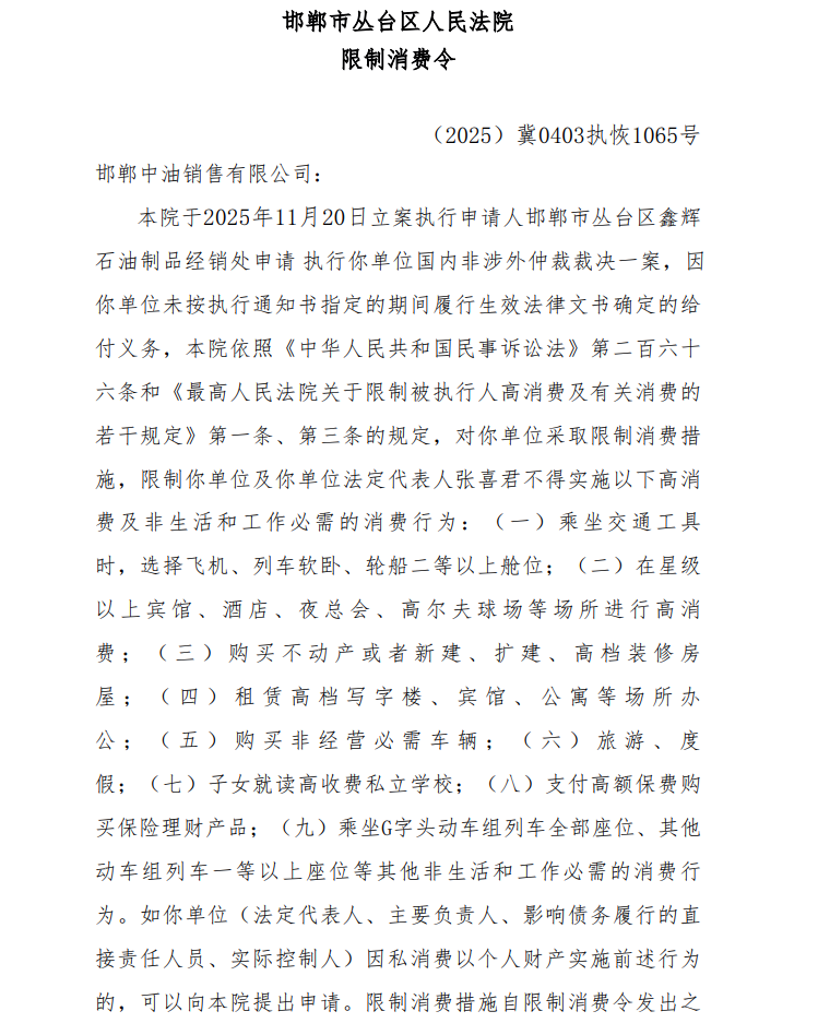 据中国执行信息公开网信息,2025年12月4日,因“邯郸市丛台区鑫辉石油制品经销处申请执行邯郸中油销售有限公司国内非涉外仲裁裁决一案,未按执行通知书履行法律文书确定的给付义务”的问题,邯郸中油销售有限公司及其法定代表人于2025年11月20日被邯郸市丛台区人民法院立案执行并对该公司及法定代表人采取限制消费措施,下达限制消费令。案号为“(2025)冀0403执恢1065号”。
