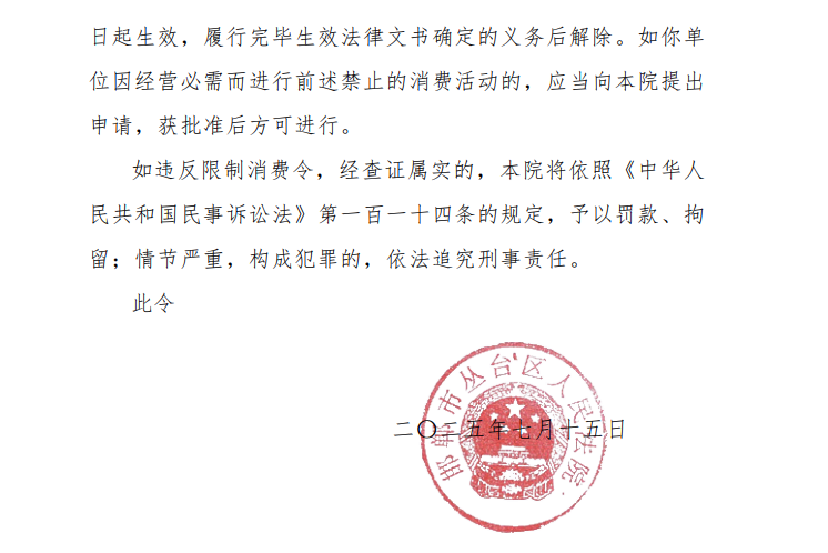 据天眼查显示,在2025年7月15日,同样该公司法定代表人智全才也被采取限制消费措施。案号为“(2025)冀0403执恢1587号”。