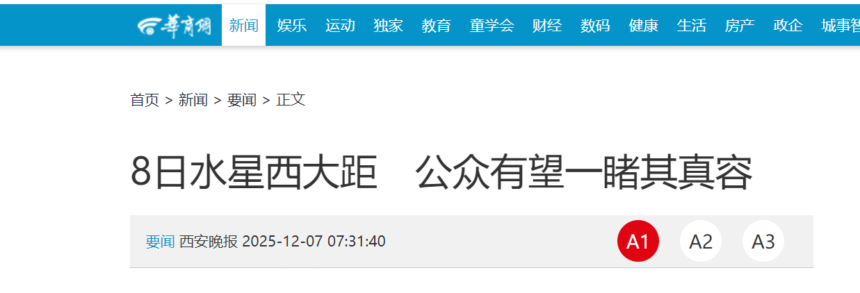 刘仲利告诉记者,今年水星共有3次西大距,其中8月和12月两次的观测条件都很好。本月8日前后,日出时水星的地平高度约17度,亮度约0等,“这是今年最后一次观测这颗‘晨星’的窗口期,下次再看到水星就是2026年2月了。”