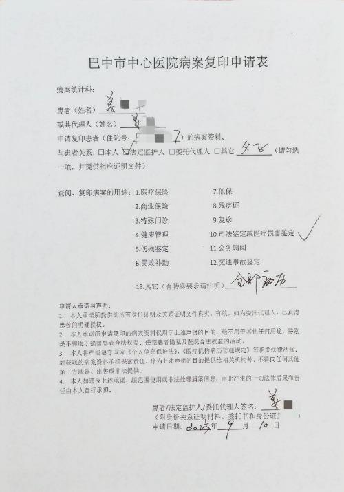 另一份落款时间为9月10日的《巴中市中心医院病案复印申请表》则显示,模式与此前的申请书大有不同,其中查阅、复印病案的用途选项增加到了13项,并有了明确的“司法鉴定或医疗损害鉴定”选项,“其他”选项后面也备注了“有特殊要求请注明”。下方还多了申请人承诺与声明,包含:本人承诺所申请复印的病案资料仅用于上述声明的目的以及本人如违反上述承诺,超范围使用或非法处理病案信息,由此产生的一切法律后果和责任由本人自行承担等内容。