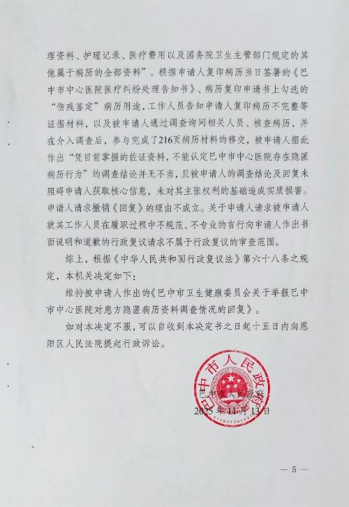姜先生说,今年8月,在进入医疗损害鉴定程序时,他发现医院自行提交的病历资料竟然有200多页,而自己原本从医院复印出来的并非完整版病历,导致无法用于鉴定。因此他认为院方实际是隐匿了关键病历资料,并以此为由向巴中市卫健委进行了实名举报,但得到的答复是不能认定医院存在隐匿病历行为。于是他又申请了行政复议,今年11月,巴中市人民政府出具《行政复议决定书》,认为卫健委的调查结论并无不当,决定维持此前卫健委作出的答复。