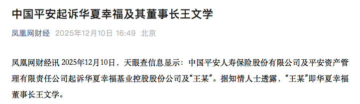 凤凰网财经讯2025年12月10日,天眼查信息显示:中国平安人寿保险股份有限公司及平安资产管理有限责任公司起诉华夏幸福基业控股股份公司及“王某”。据知情人士透露,“王某”即华夏幸福董事长王文学。