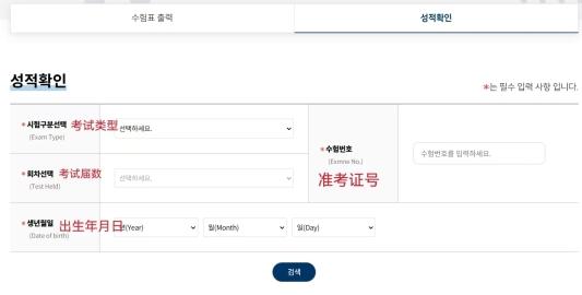 ·最后点击검색(查询),就可以查询成绩。