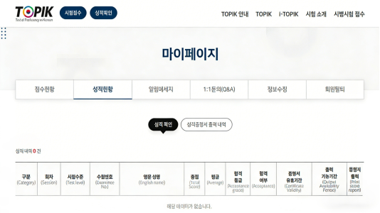 ·登录后点击‘성적확인’(成绩确认),对应的成绩内容就会出现在下方。页面跳转后,再点击下方图中的‘성적확인’(成绩确认)即可查成绩。