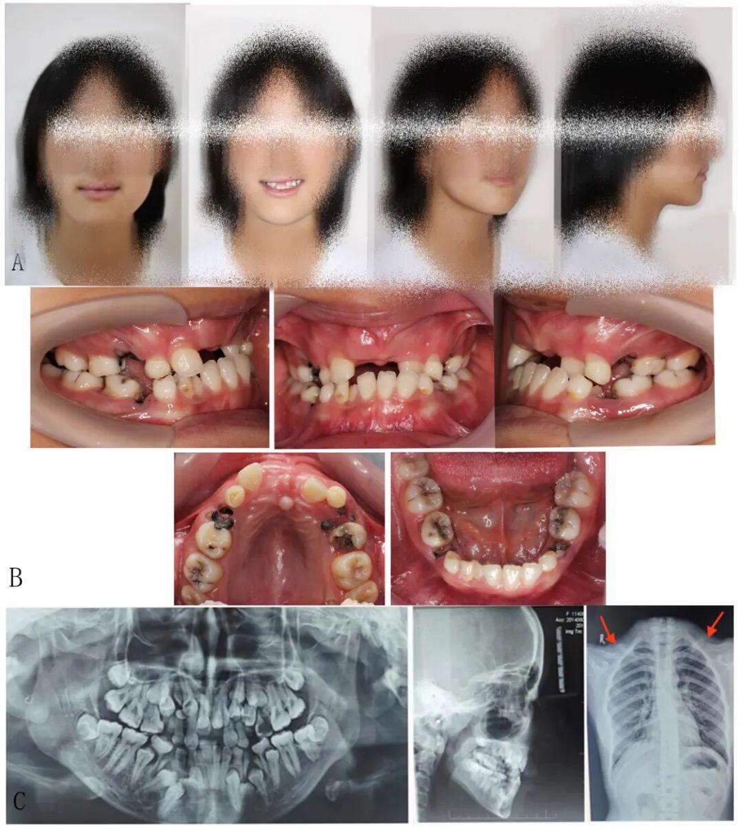 同时,X光片还提示伴有面部不对称等,这些全身特征高度指向一种罕见的遗传性疾病:颅骨锁骨发育不全综合征(CCD)。