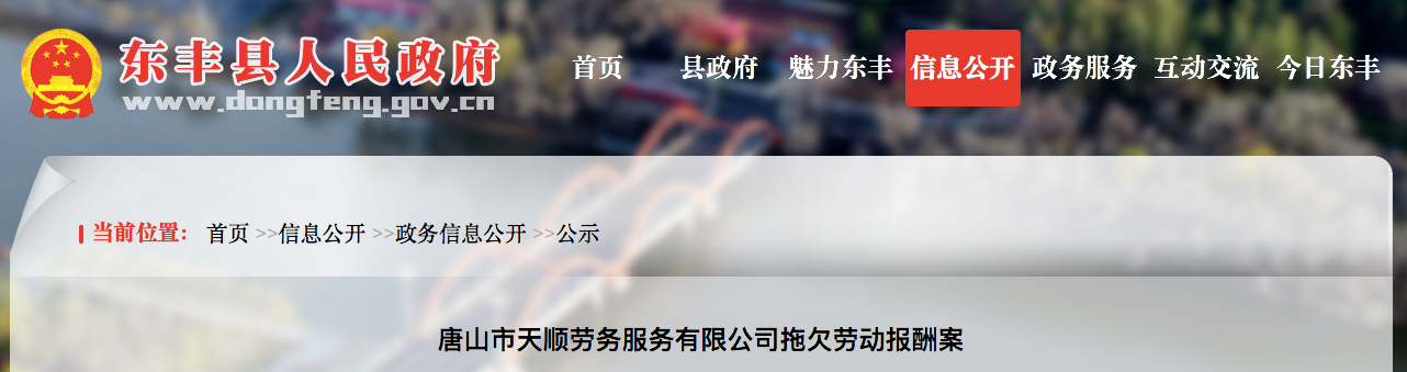 据吉林省东丰县人民政府官网公开信息,近日,东丰县人力资源和社会保障局公示了唐山市天顺劳务服务有限公司拖欠劳动报酬案。公告显示,2025年5月27日,吉林省东丰县人力资源和社会保障局接到劳动者投诉,反映唐山市天顺劳务服务有限公司存在拖欠劳动报酬问题。
