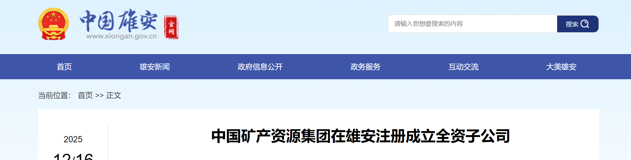 12月5日,中国矿产资源集团(以下简称“中国矿产”)在河北雄安新区注册成立全资子公司——中国矿产资源集团国际铁矿石贸易有限公司。