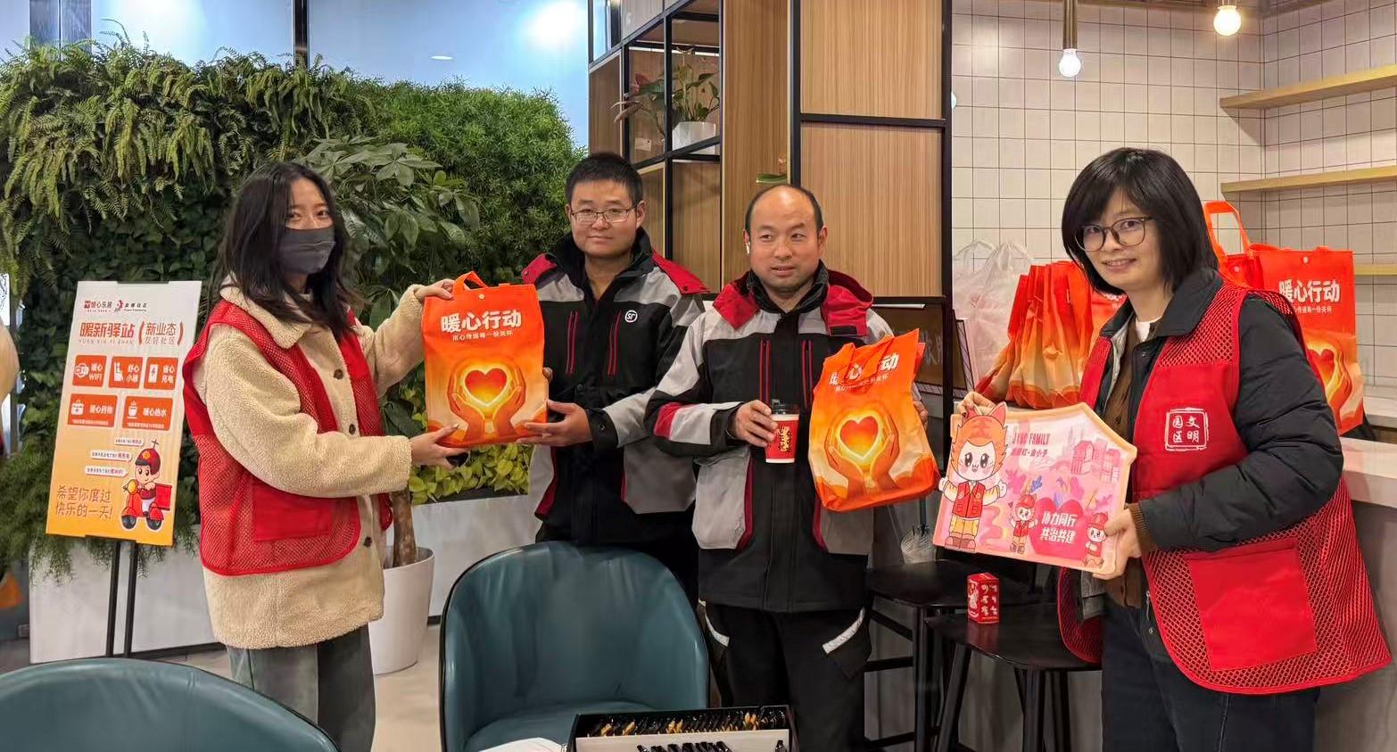 活动中,工作人员深知“骑士”时间宝贵,特意将暖心流程安排得简洁高效。他们快步迎上前,将一个个暖冬礼包递到骑手手中:“这是加绒手套,下雨天也能用。”“面罩戴上,挡风不耽误说话。”——每句叮嘱都简短实用。保温杯里盛着滚烫的姜茶,旁边摆放着可以随手带走的独立包装糕点。